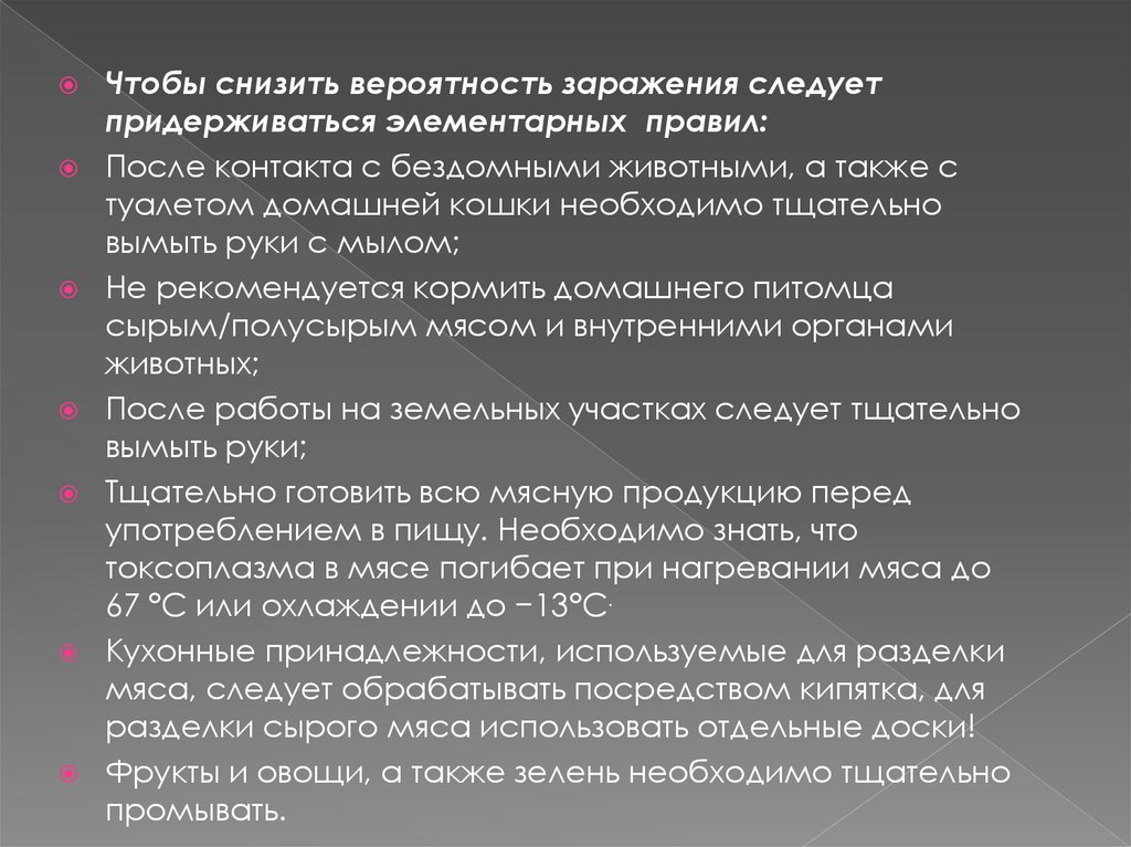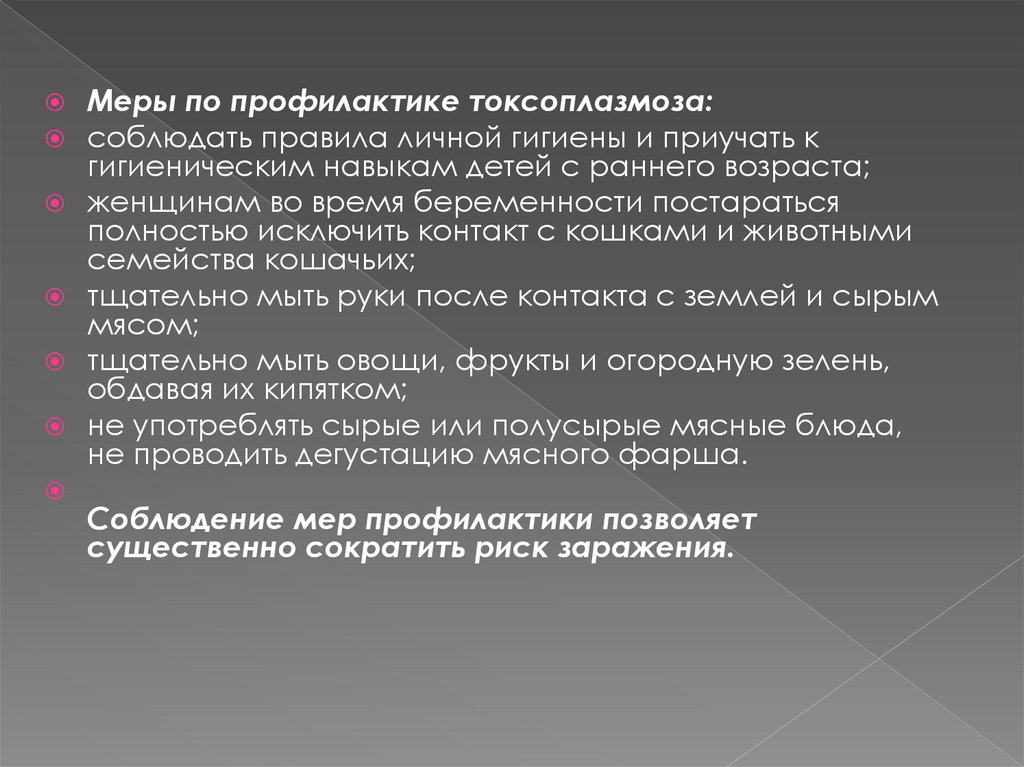 Меры по профилактике токсоплазмоза:соблюдать правила личной гигиены и приучать к