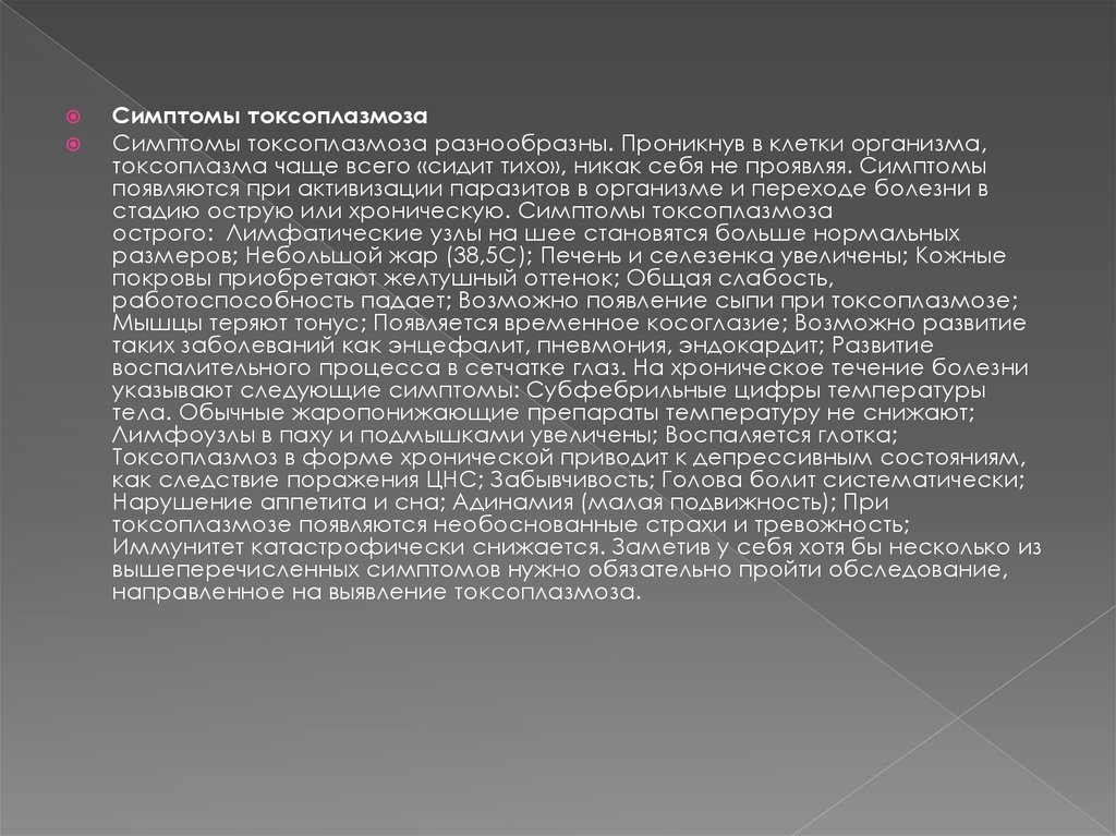 Симптомы токсоплазмозаСимптомы токсоплазмоза разнообразны. Проникнув в клетки организма,