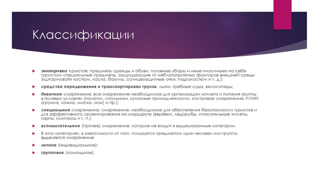 Классификацииэкипировка туристов: предметы одежды и обуви, головные уборы и иные «носимые» на себе