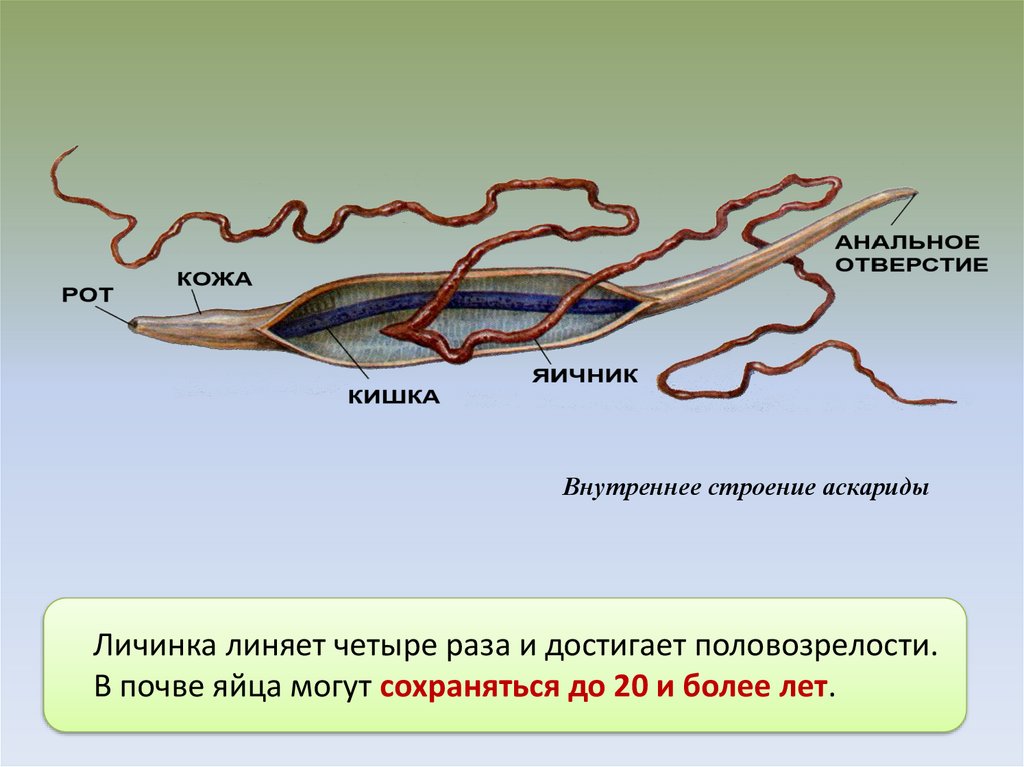 Внутреннее строение аскаридыЛичинка линяет четыре раза и достигает половозрелости.