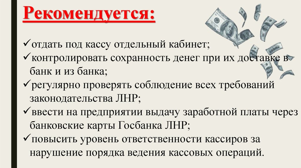 Рекомендуется:отдать под кассу отдельный кабинет;