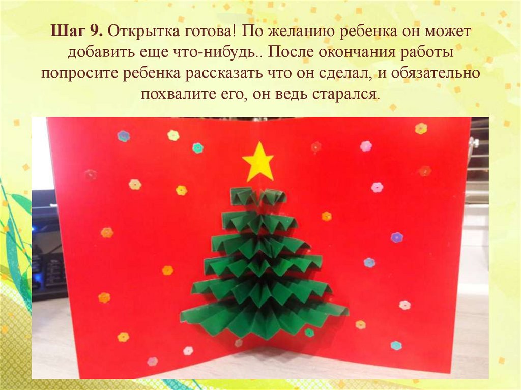 Шаг 9. Открытка готова! По желанию ребенка он можетдобавить еще что-нибудь.. После окончания работы