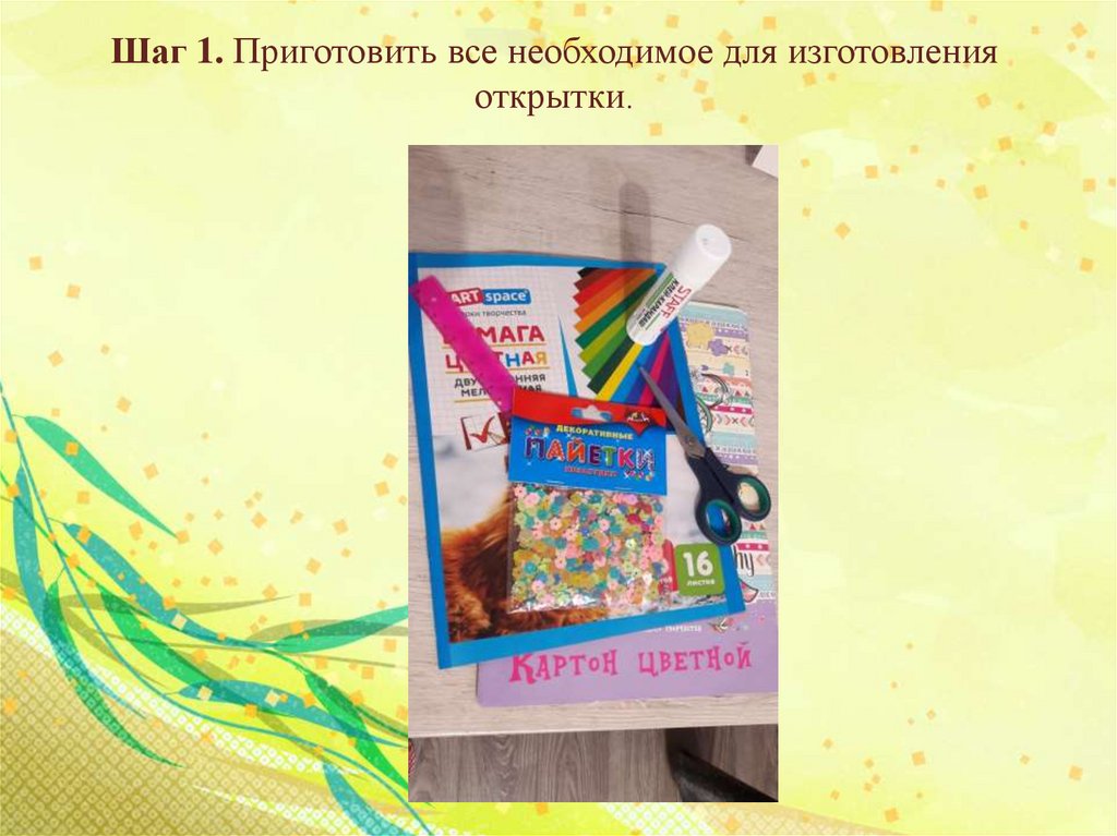Шаг 1. Приготовить все необходимое для изготовленияоткрытки.