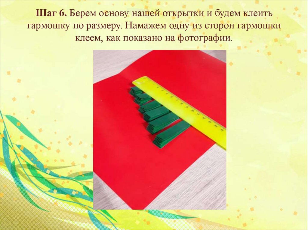 Шаг 6. Берем основу нашей открытки и будем клеитьгармошку по размеру. Намажем одну из сторон гармошки
