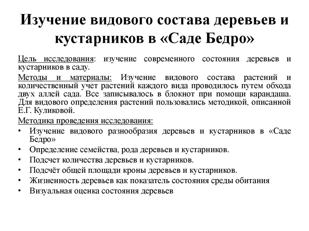 Изучение видового состава деревьев икустарников в «Саде Бедро»
