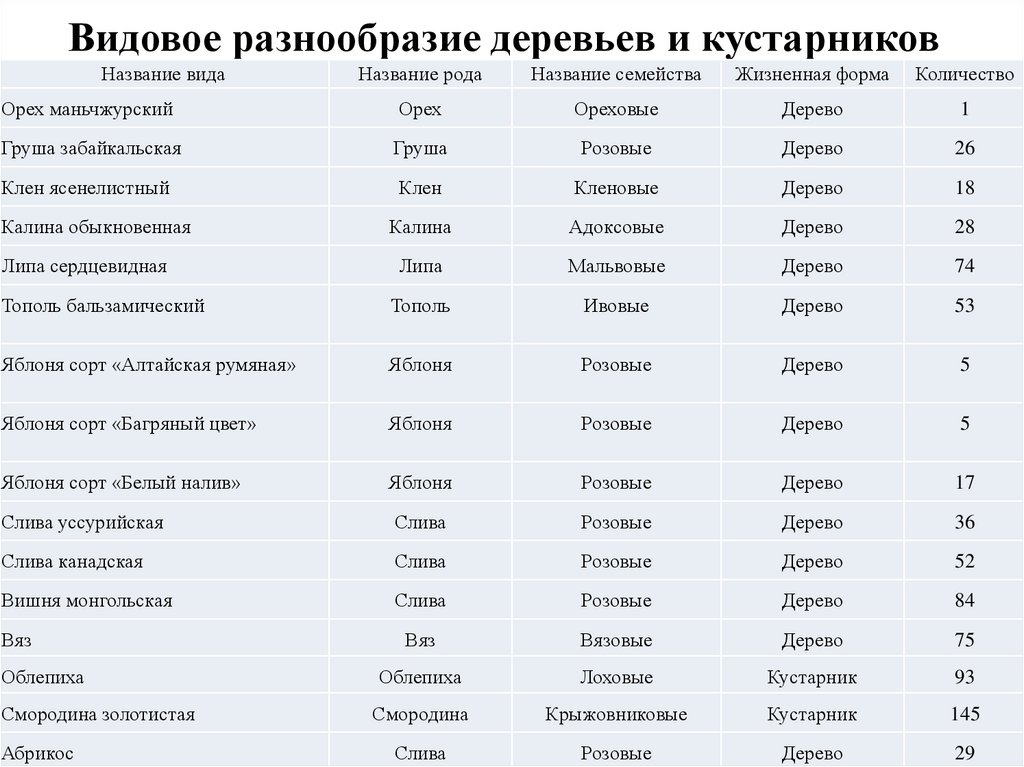 Видовое разнообразие деревьев и кустарниковНазвание вида