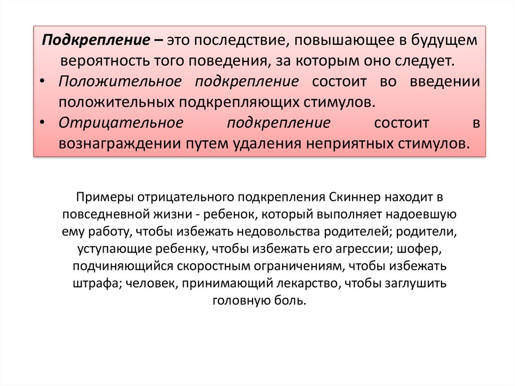 Подкрепление – это последствие, повышающее в будущемвероятность того поведения, за которым оно следует.