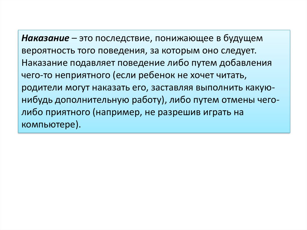 Наказание – это последствие, понижающее в будущемвероятность того поведения, за которым оно следует.