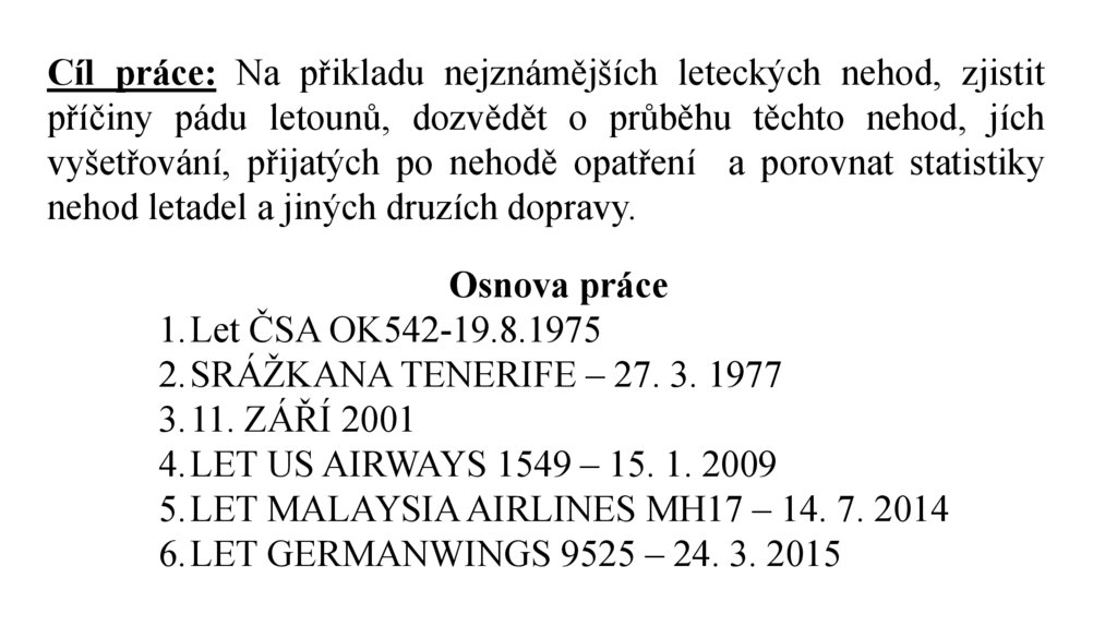 Cíl práce: Na přikladu nejznámějších leteckých nehod, zjistitpříčiny pádu letounů, dozvědět o průběhu těchto nehod, jích