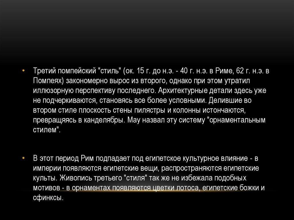 • Третий помпейский "стиль" (ок. 15 г. до н.э. - 40 г. н.э. в Риме, 62 г. н.э. вПомпеях) закономерно вырос из второго, однако при этом утратил