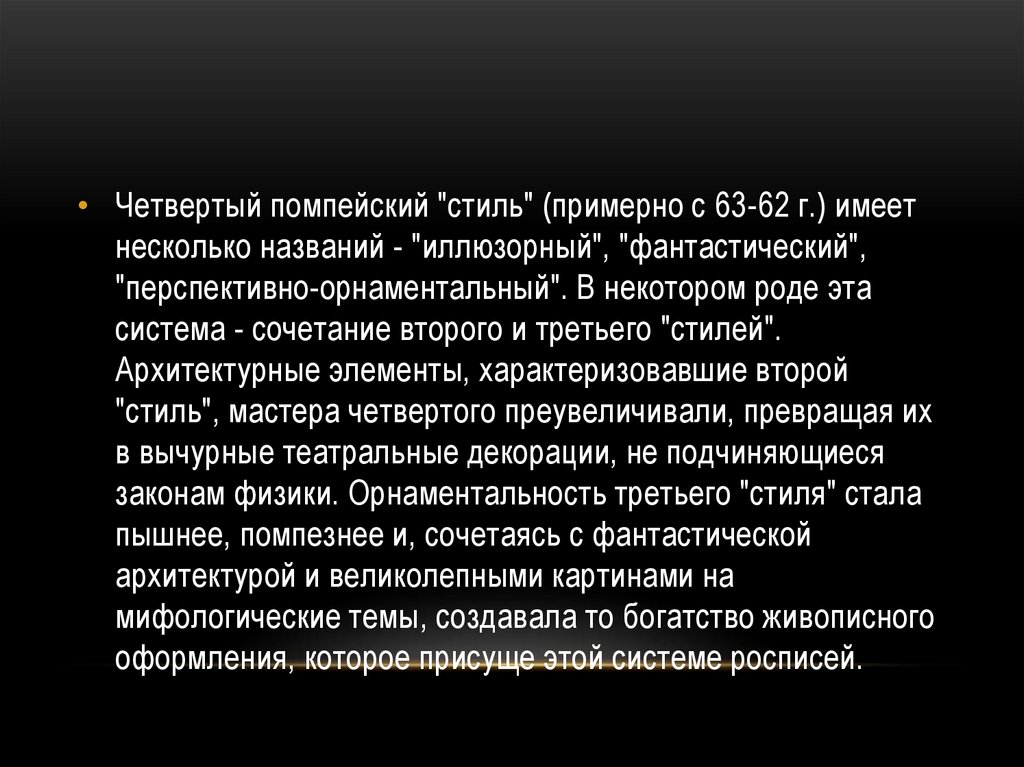 • Четвертый помпейский "стиль" (примерно с 63-62 г.) имеетнесколько названий - "иллюзорный", "фантастический",