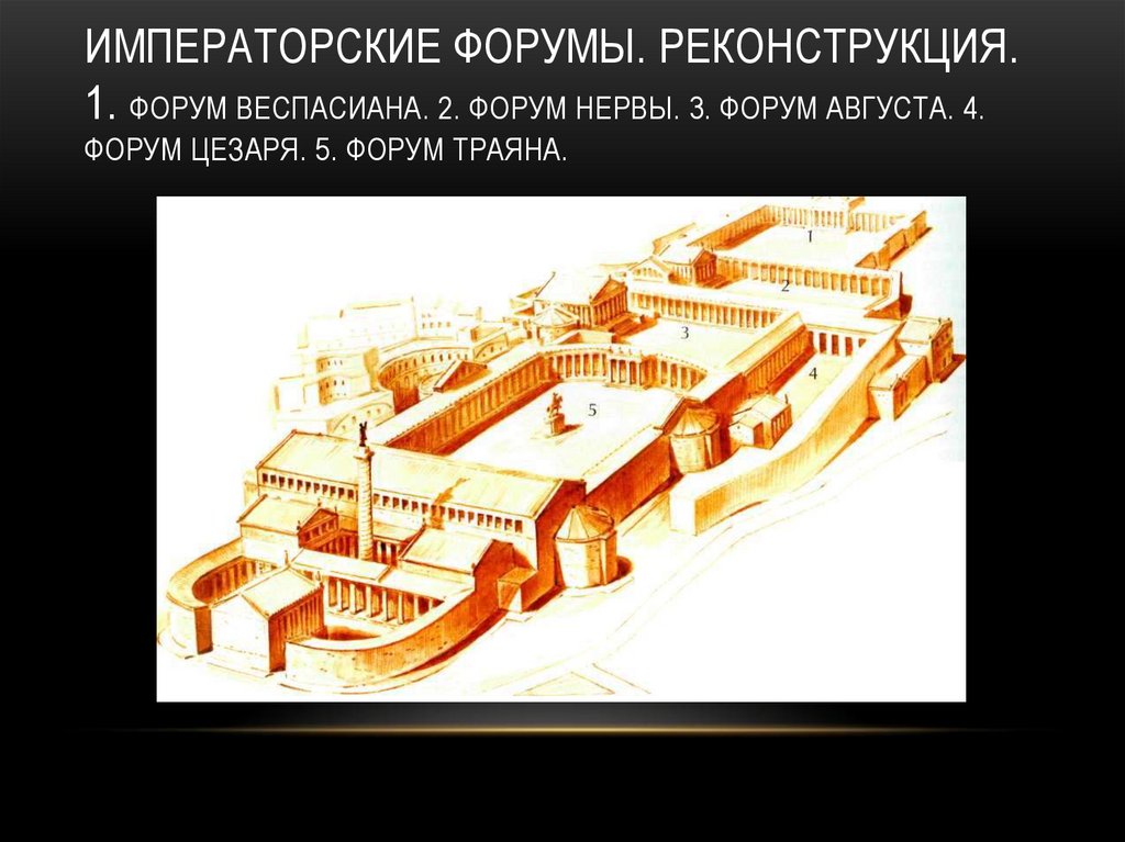 ИМПЕРАТОРСКИЕ ФОРУМЫ. РЕКОНСТРУКЦИЯ.1. ФОРУМ ВЕСПАСИАНА. 2. ФОРУМ НЕРВЫ. 3. ФОРУМ АВГУСТА. 4.