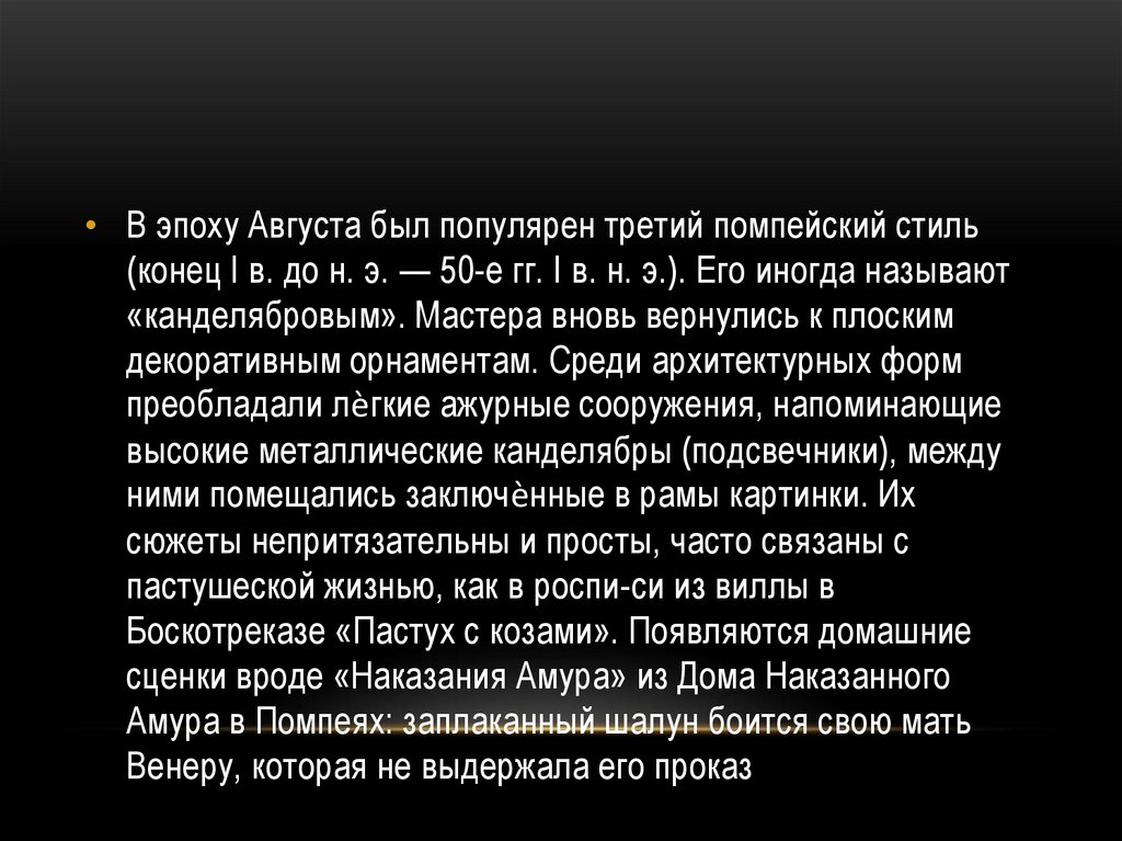 • В эпоху Августа был популярен третий помпейский стиль(конец I в. до н. э. — 50-е гг. I в. н. э.). Его иногда называют