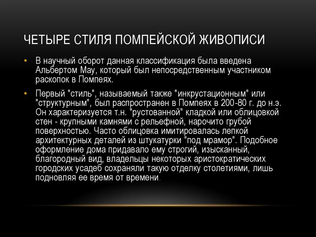 ЧЕТЫРЕ СТИЛЯ ПОМПЕЙСКОЙ ЖИВОПИСИ• В научный оборот данная классификация была введена
