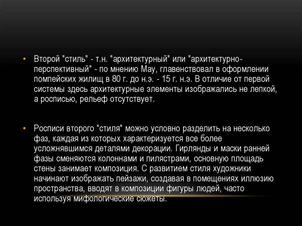 • Второй "стиль" - т.н. "архитектурный" или "архитектурноперспективный" - по мнению Мау, главенствовал в оформлениипомпейских жилищ в 80 г. до н.э. - 15 г. н.э. В отличие от первой