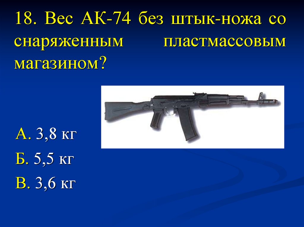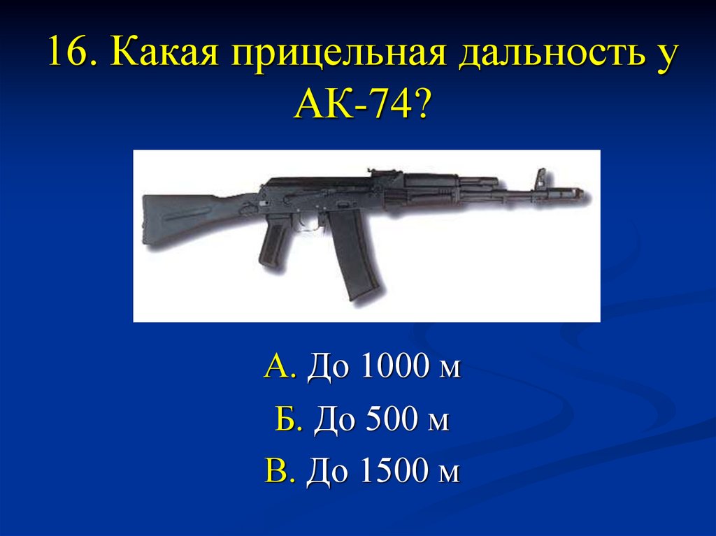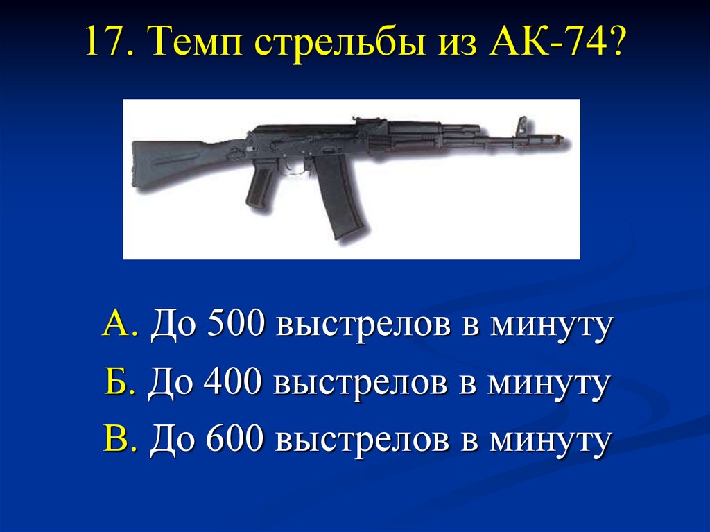 17. Темп стрельбы из АК-74?А. До 500 выстрелов в минуту