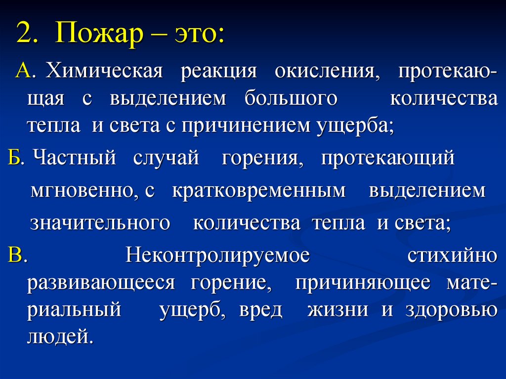 2. Пожар – это:А. Химическая реакция окисления, протекающая с выделением большого
