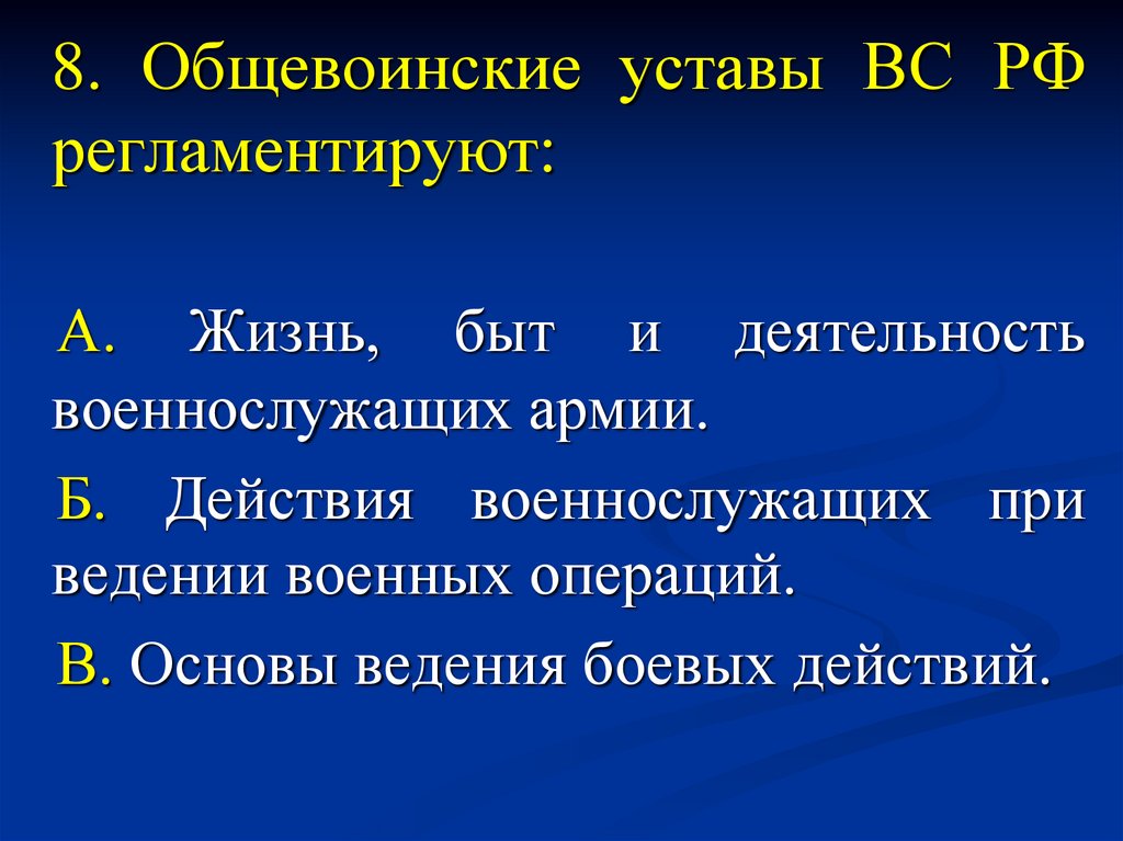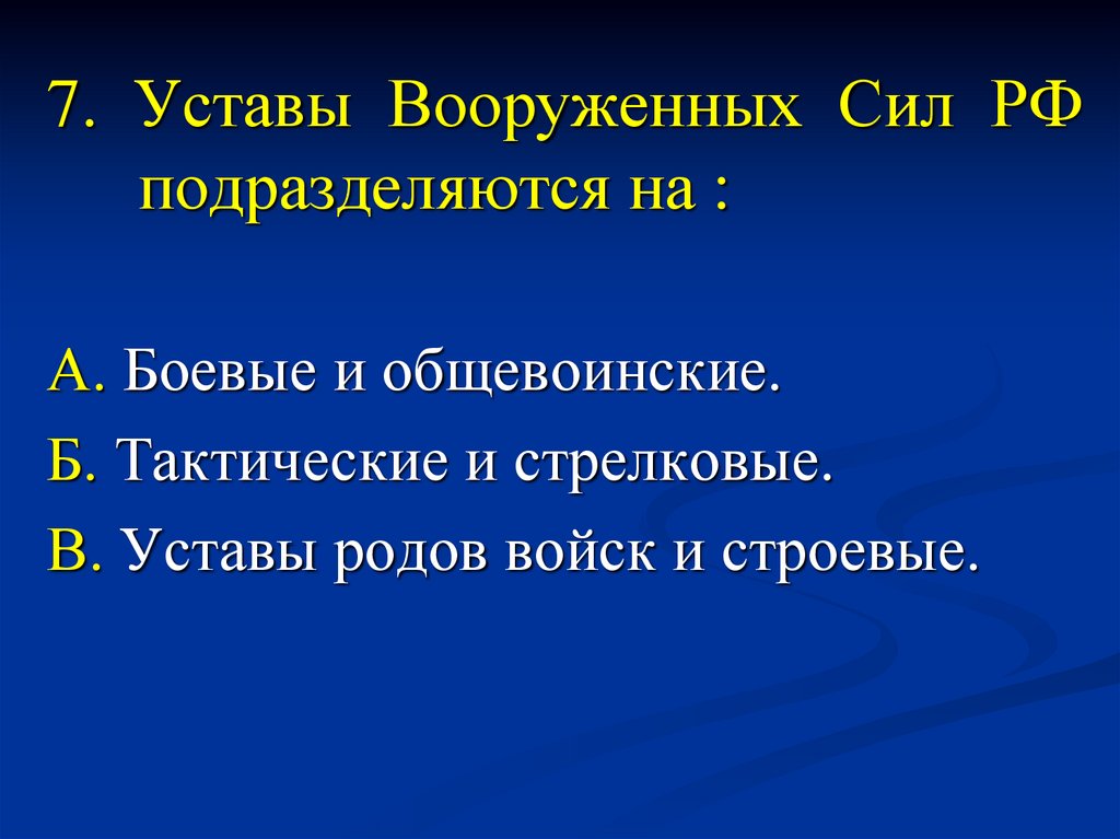 7. Уставы Вооруженных Сил РФподразделяются на :