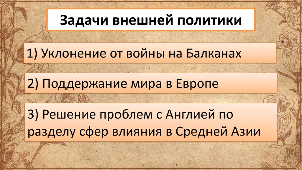 Задачи внешней политики1) Уклонение от войны на Балканах