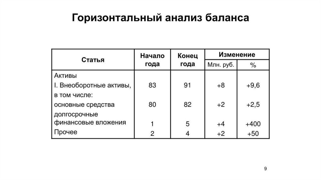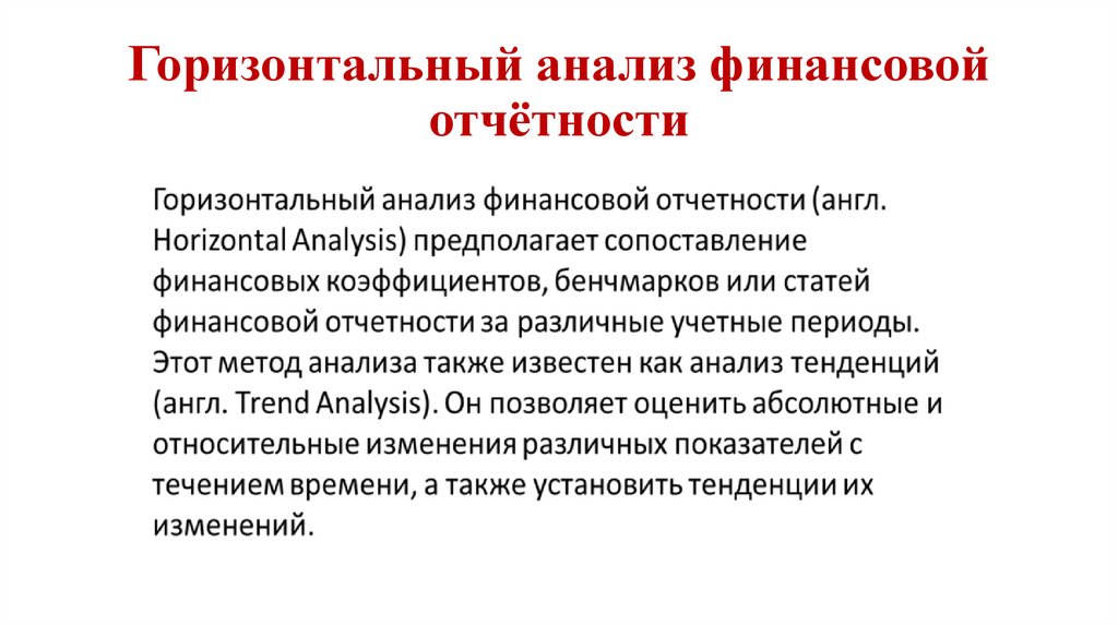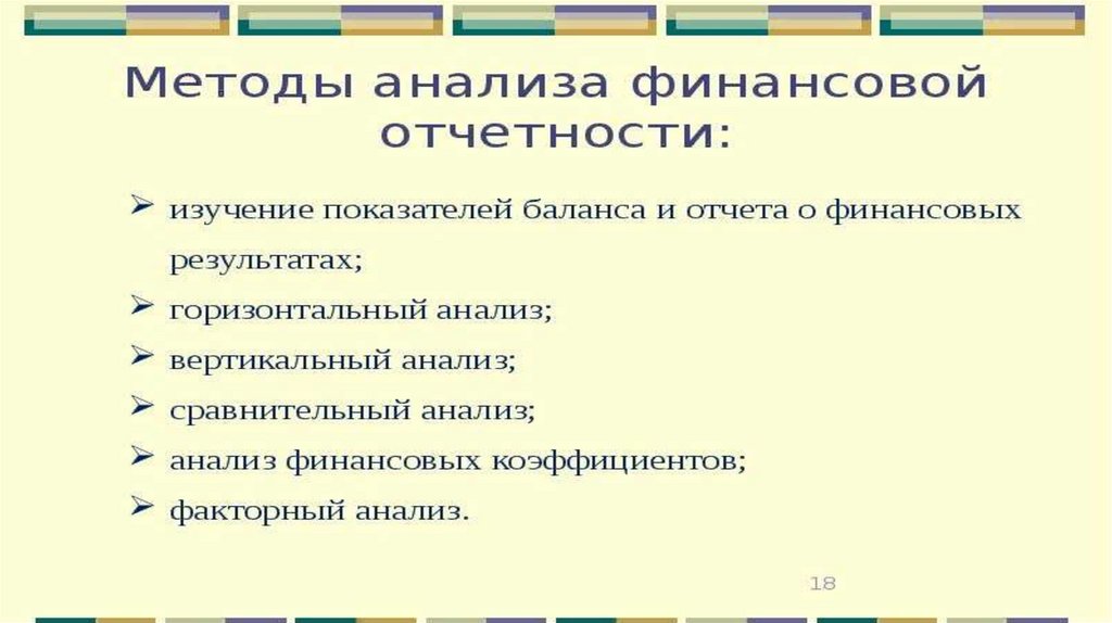 • Основные методы анализа отчетности: чтение отчетности, горизонтальный
