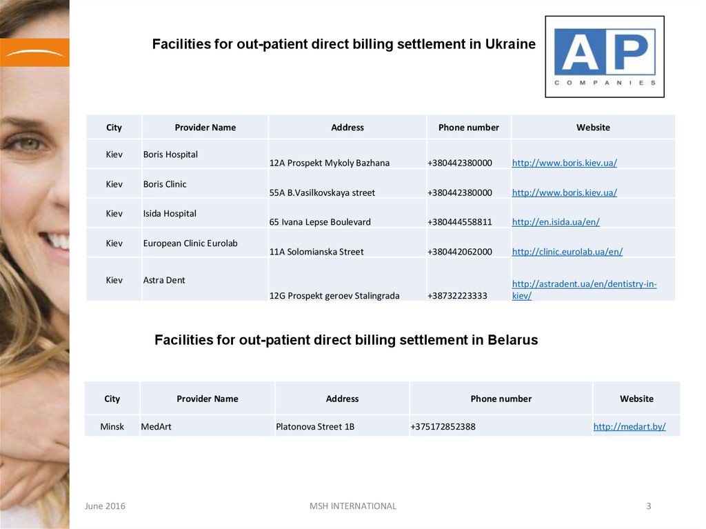 Facilities for out-patient direct billing settlement in UkraineCity
