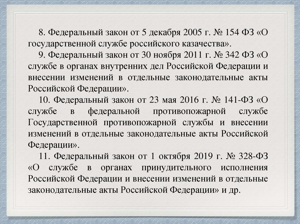8. Федеральный закон от 5 декабря 2005 г. № 154 ФЗ «Огосударственной службе российского казачества».