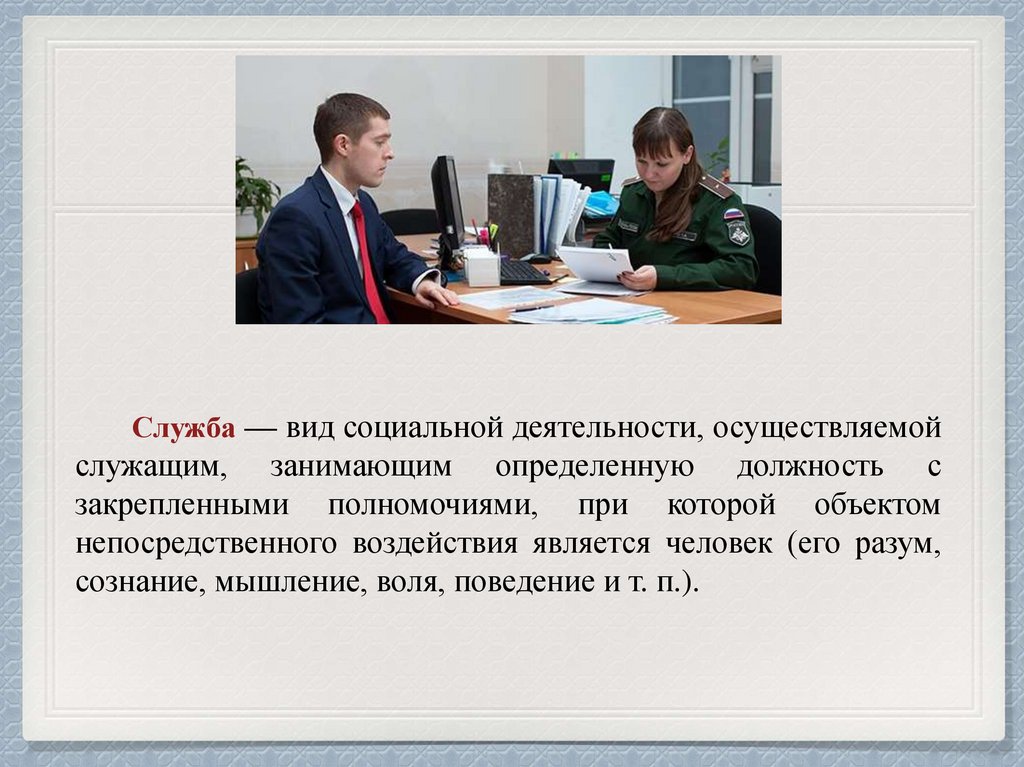 Служба — вид социальной деятельности, осуществляемойслужащим, занимающим определенную должность с