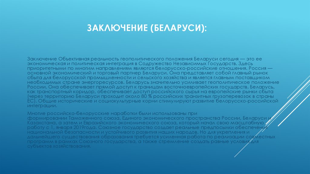 ЗАКЛЮЧЕНИЕ (БЕЛАРУСИ):Заключение Объективная реальность геополитического положения Беларуси сегодня — это ее