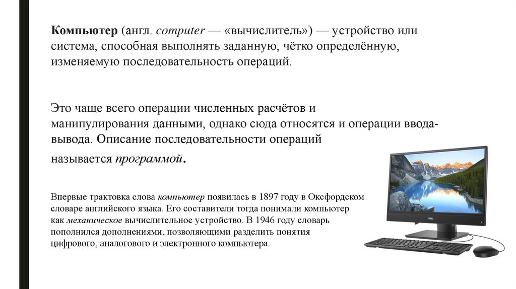 Компьютер (англ. computer — «вычислитель») — устройство илисистема, способная выполнять заданную, чётко определённую,