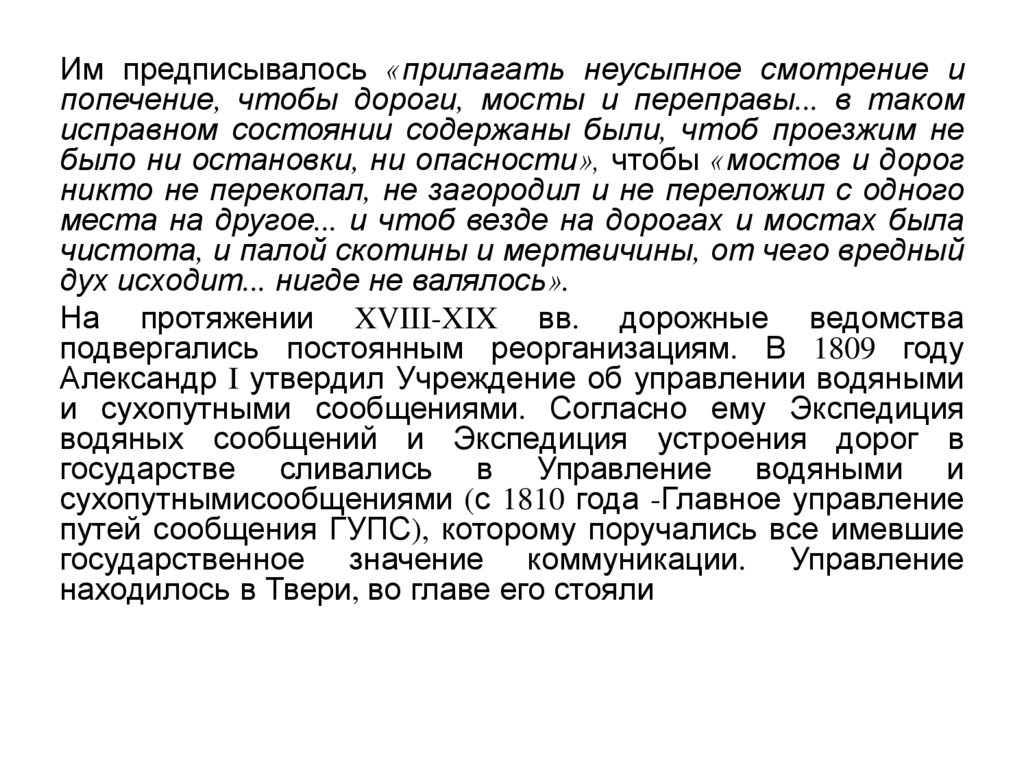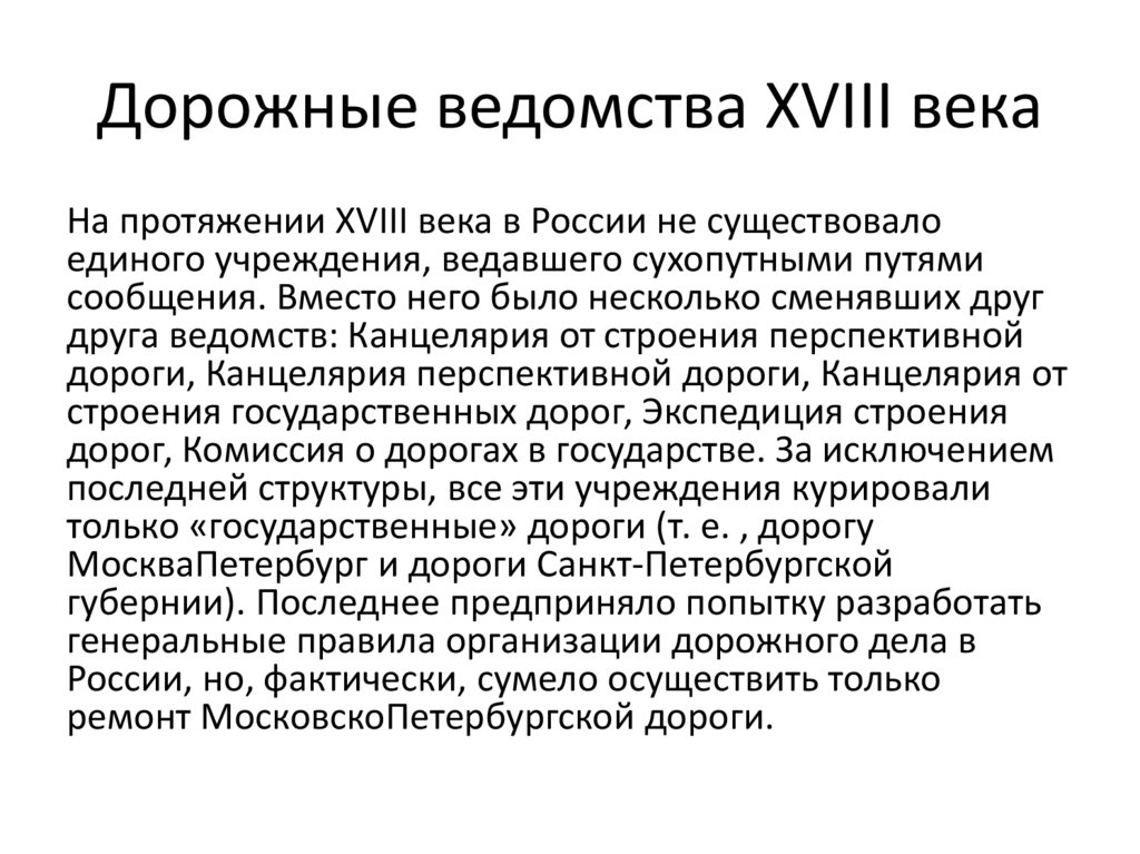Дорожные ведомства XVIII векаНа протяжении XVIII века в России не существовало