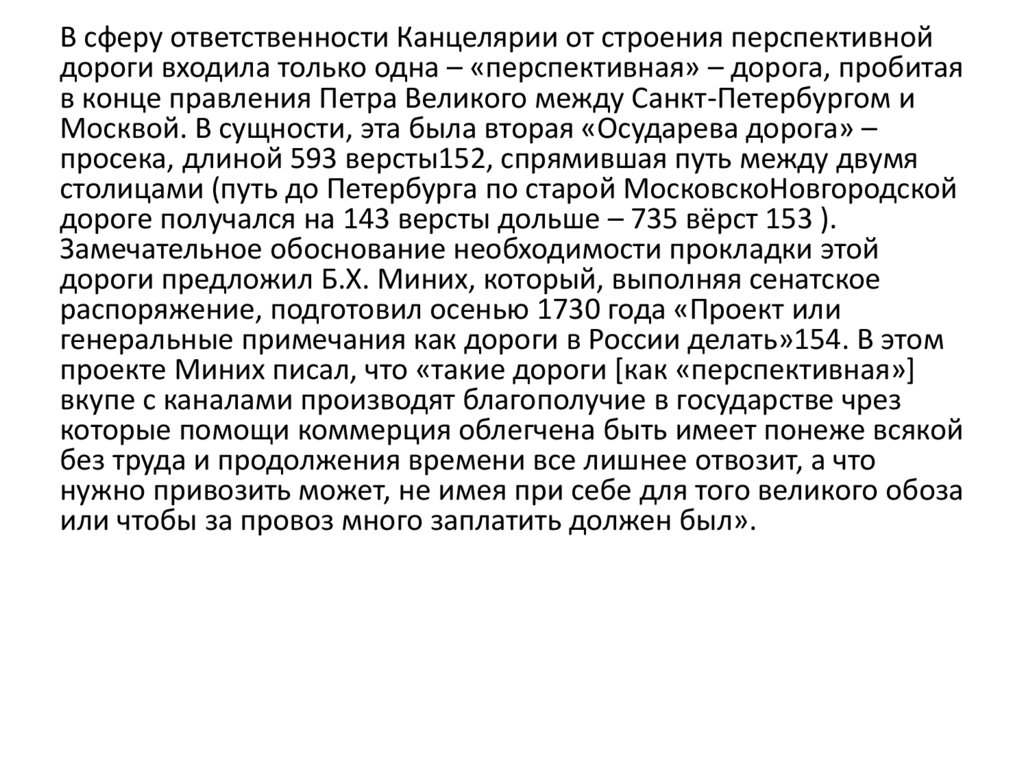 проекте Миних писал, что «такие дороги [как «перспективная»]