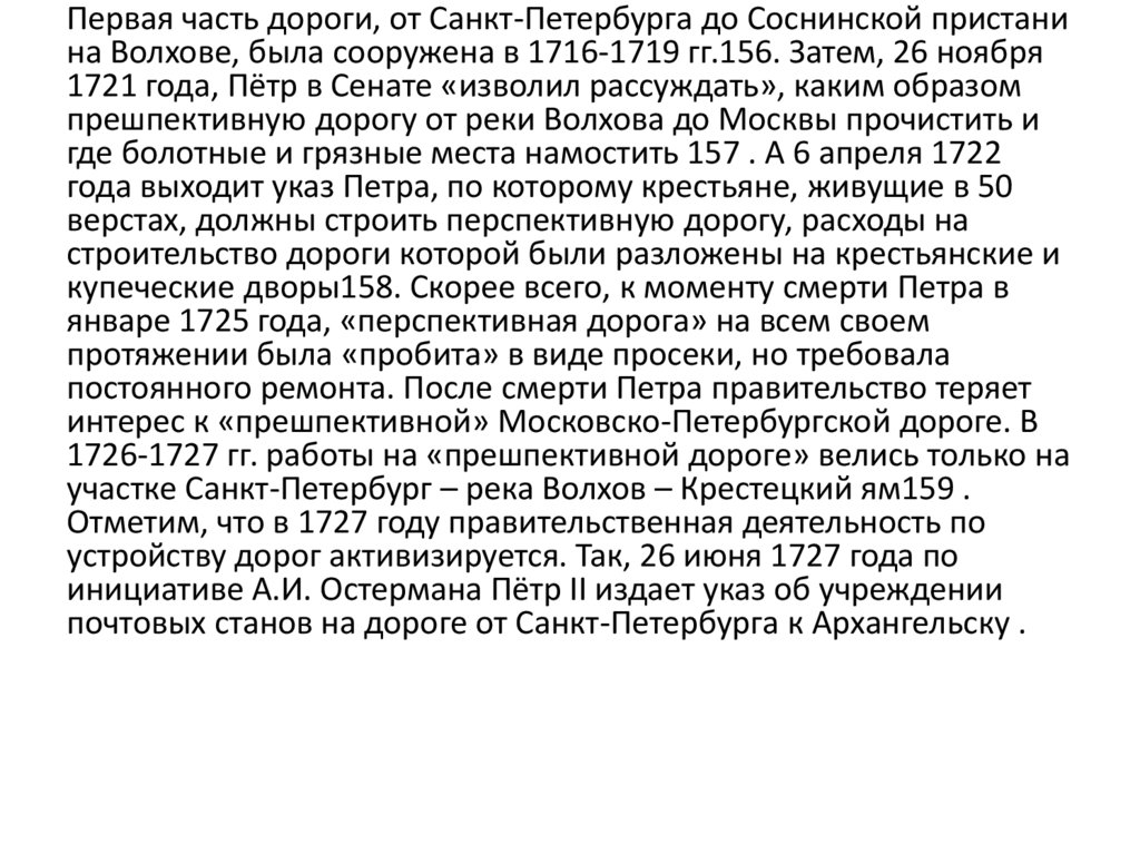 Первая часть дороги, от Санкт-Петербурга до Соснинской пристанина Волхове, была сооружена в 1716-1719 гг.156. Затем, 26 ноября