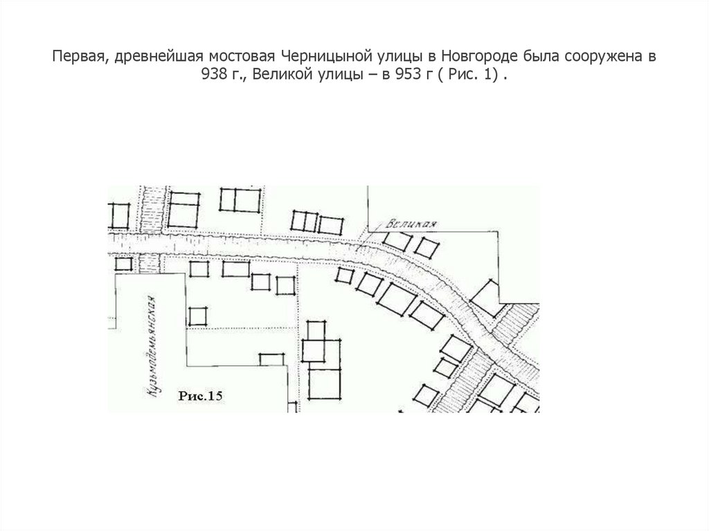 Первая, древнейшая мостовая Черницыной улицы в Новгороде была сооружена в938 г., Великой улицы – в 953 г ( Рис. 1) .