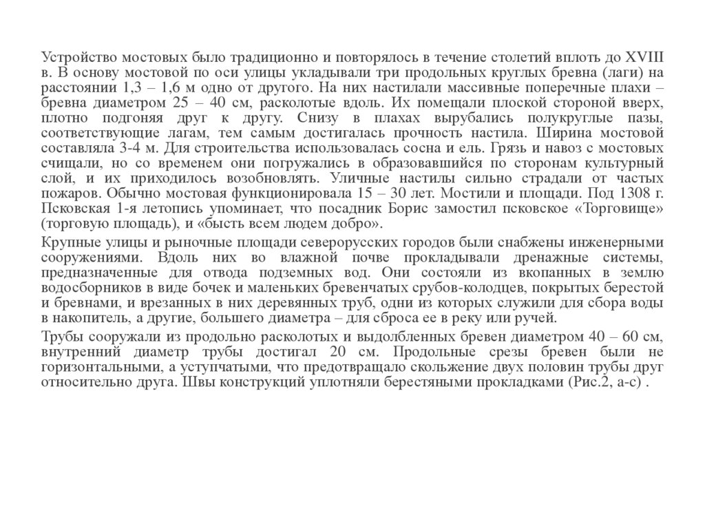 Устройство мостовых было традиционно и повторялось в течение столетий вплоть до XVIIIв. В основу мостовой по оси улицы укладывали три продольных круглых бревна (лаги) на