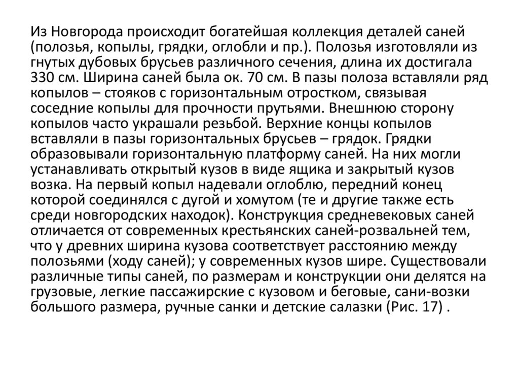 Из Новгорода происходит богатейшая коллекция деталей саней(полозья, копылы, грядки, оглобли и пр.). Полозья изготовляли из