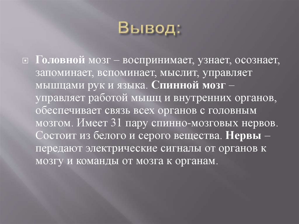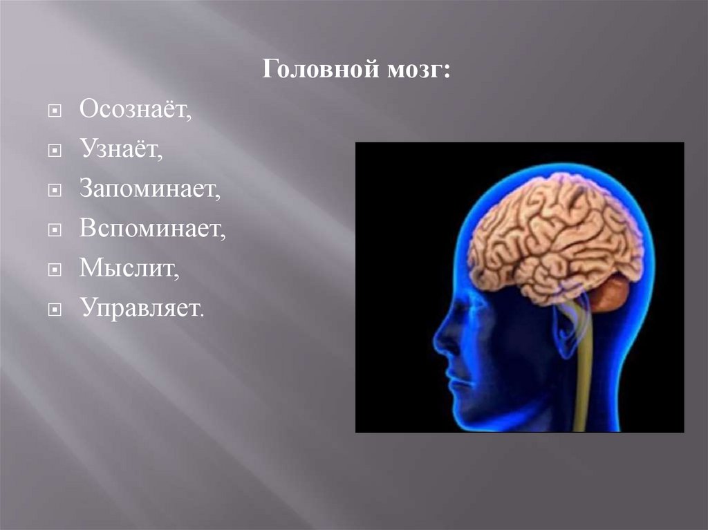 Головной мозг – воспринимает, узнает, осознает,запоминает, вспоминает, мыслит, управляет