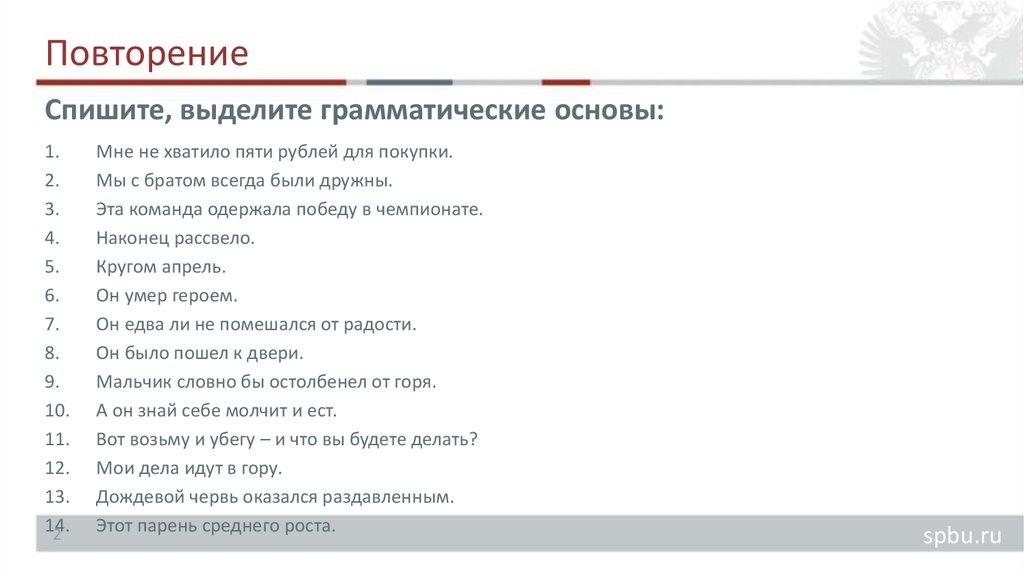 ПовторениеСпишите, выделите грамматические основы: