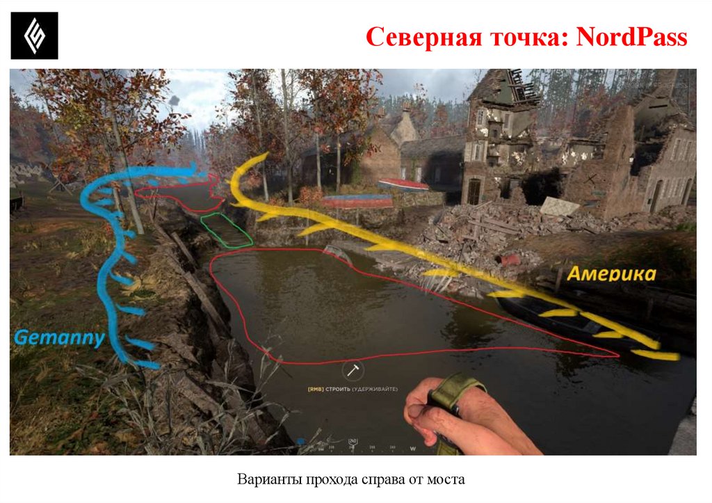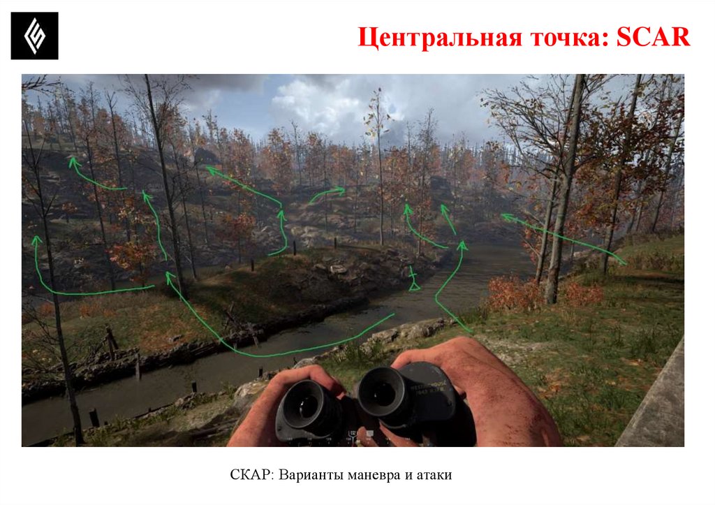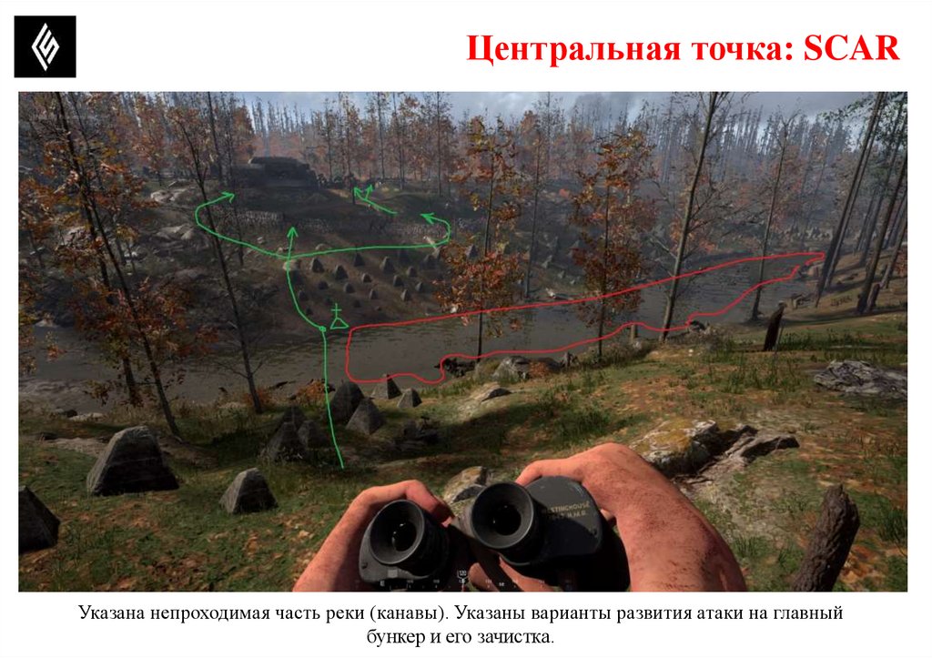 Центральная точка: SCARУказана непроходимая часть реки (канавы). Указаны варианты развития атаки на главный