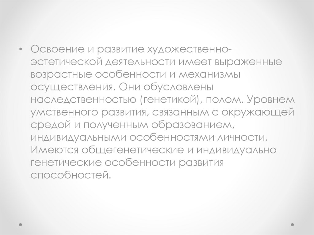 • Освоение и развитие художественноэстетической деятельности имеет выраженныевозрастные особенности и механизмы