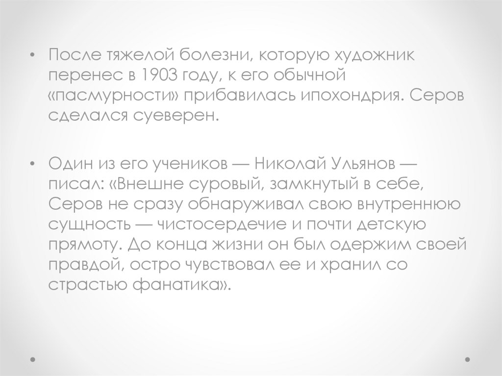 • После тяжелой болезни, которую художникперенес в 1903 году, к его обычной