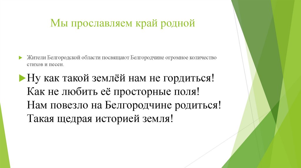 Мы прославляем край роднойЖители Белгородской области посвящают Белгородчине огромное количество