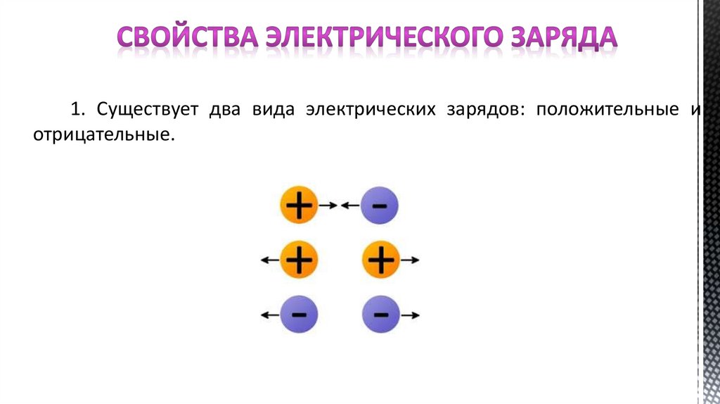 1. Существует два вида электрических зарядов: положительные иотрицательные.
