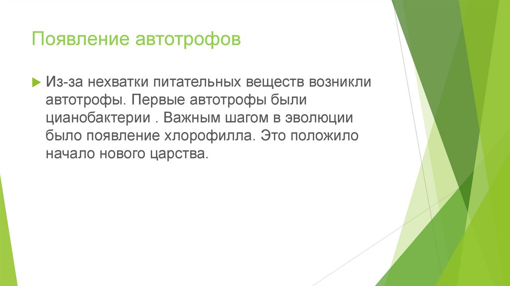 Появление автотрофовИз-за нехватки питательных веществ возникли