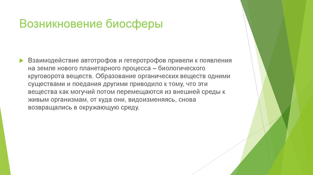 Возникновение биосферыВзаимодействие автотрофов и гетеротрофов привели к появления