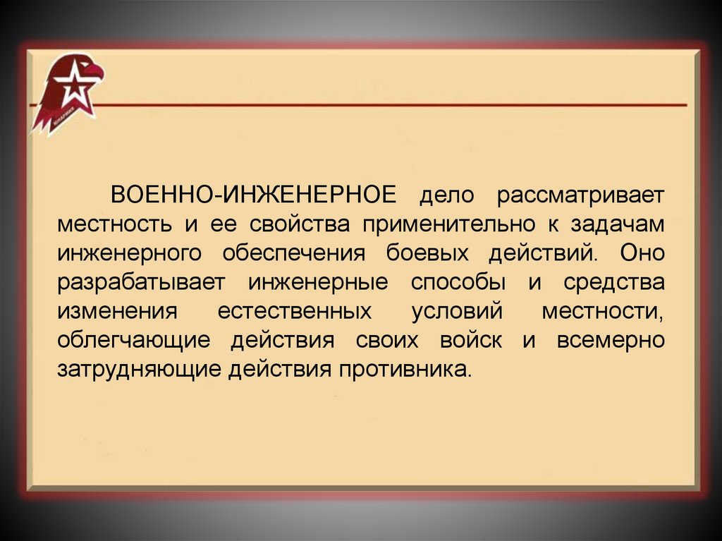 ВОЕННО-ИНЖЕНЕРНОЕ дело рассматриваетместность и ее свойства применительно к задачам