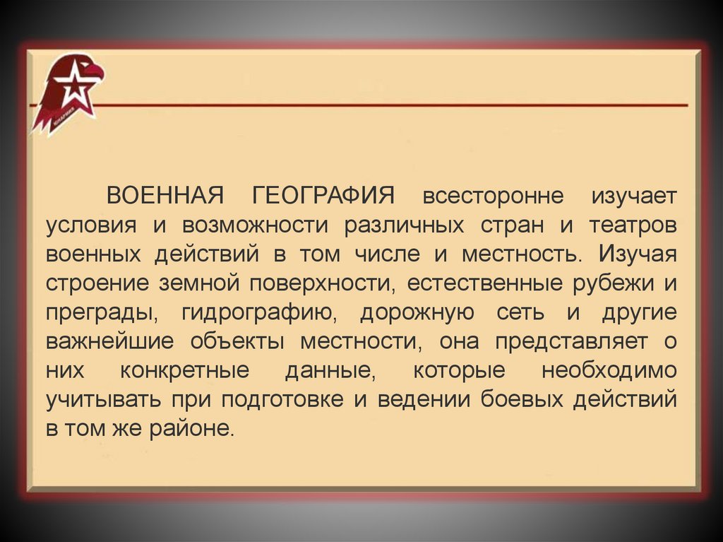 ВОЕННАЯ ГЕОГРАФИЯ всесторонне изучаетусловия и возможности различных стран и театров
