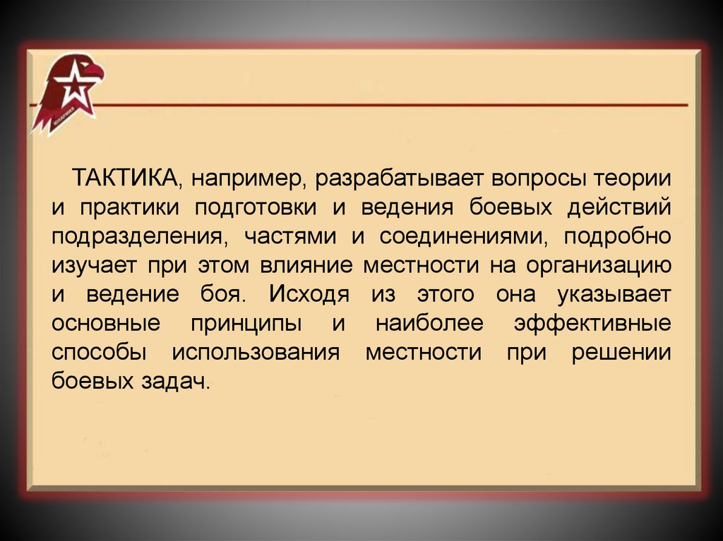 ТАКТИКА, например, разрабатывает вопросы теориии практики подготовки и ведения боевых действий