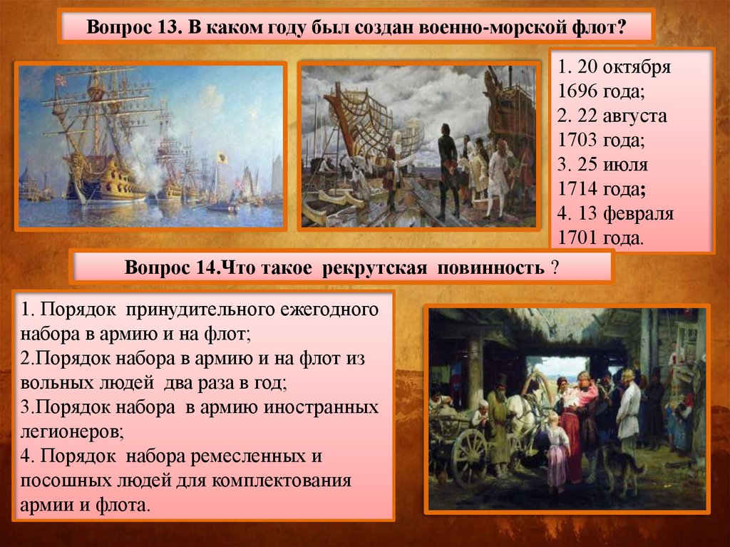 Вопрос 13. В каком году был создан военно-морской флот?1. 20 октября
