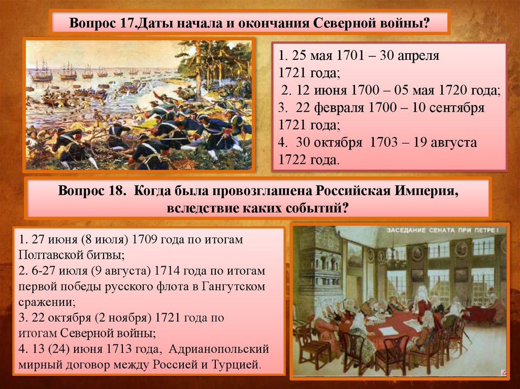 Вопрос 17.Даты начала и окончания Северной войны?1. 25 мая 1701 – 30 апреля
