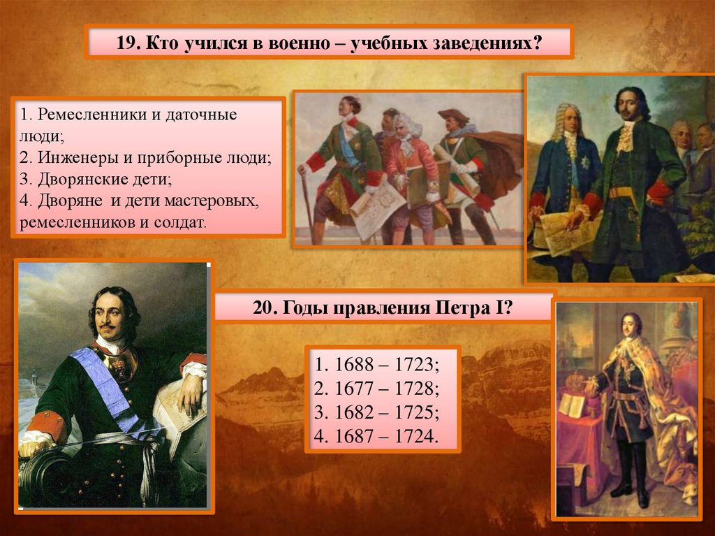 19. Кто учился в военно – учебных заведениях?1. Ремесленники и даточные